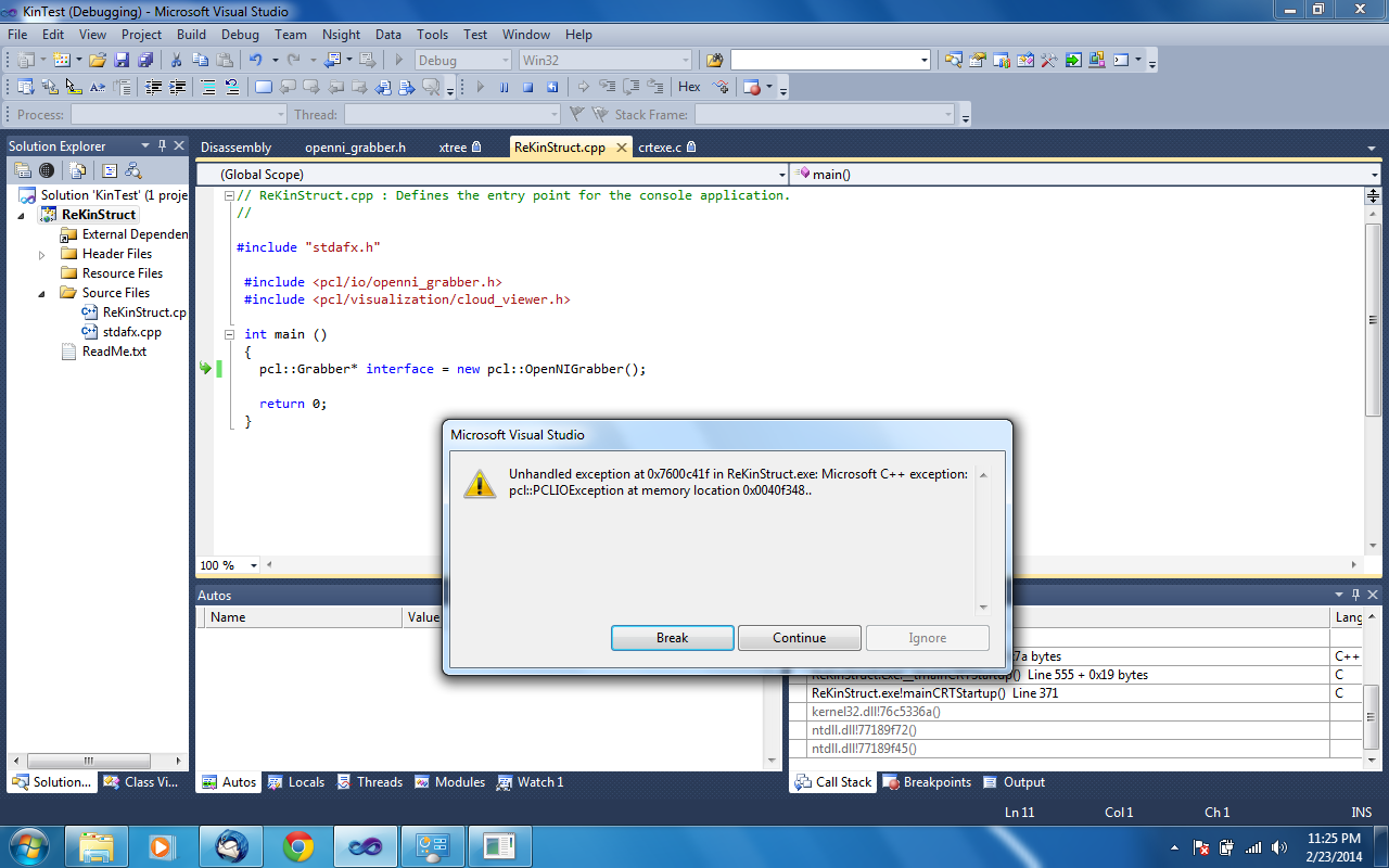 So, I was trying to obtain PCDs from the Kinect and in order to do so, I wanted to read something from the Kinect. Like I mentioned in the previous post, I had PCL and MSVC2010 installed. I had also obtained the latest version of OpenNI and SensorKinect to serve as drivers for the Kinect. And the following happened.