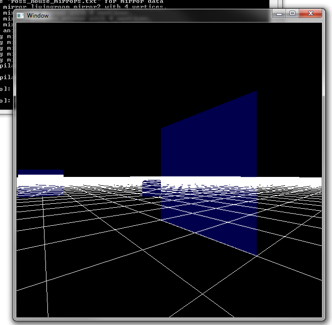 The big mirror is artificially defined and reflects the ground grid perfectly. The other mirrors are loaded from the detected mirrors in Ross’ house. As their angle is slightly offset, their reflection appears offset as well.