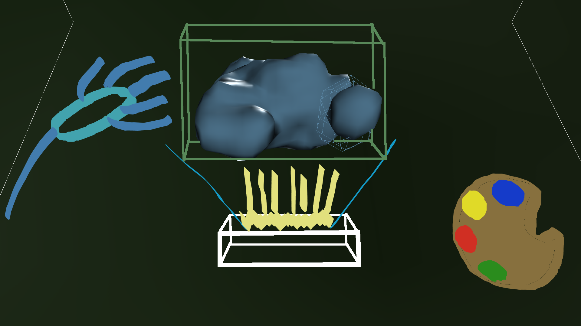 I wanted to keep things simple so instead of using two hands with the leap motion, I believe using one hand to rotate (left hand) and one hand to draw/color (right hand) makes the most sense. The left hand would be used to rotate the object on the xyz plane. The right hand, which holds the stylus, is used to pick colors and draw shapes.