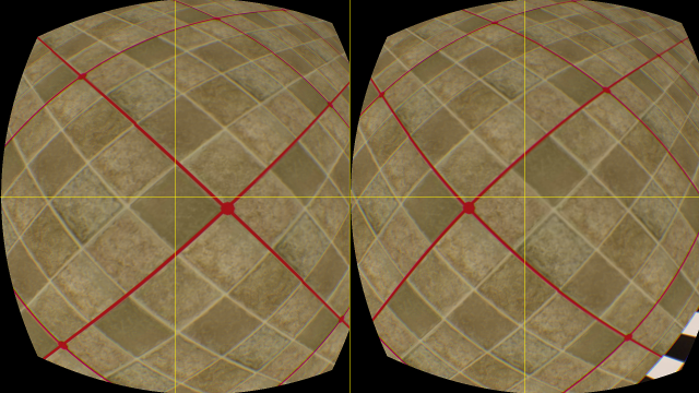 Related — the misaligned distortion may have been causing vertical disparity, which I hear is the main problem when using toe-in to create stereo pairs. Vertical disparity is accused of decreasing visual acuity; perhaps this takes the form of inattention, rather than blurriness, which would explain our suddenly becoming more attentive to other artifacts when the distortion shader was fixed. Maybe more in a future post.