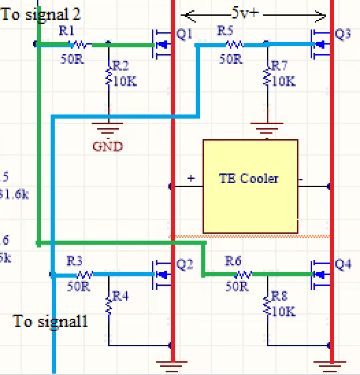 There is quite a lot of progress that has happened since my last post, but I’m going to start with the most significant breakthrough I had.  I found the source of all my problems and it stemmed from my lack of understanding of the difference between N-channel and P-channel MOSFETs. I understood that P-channel MOSFETs were used to switch HIGH side voltages, but I did not understand that the logic was the inverse to N-ch MOSFETs! What this means is that I did not know that in order to close P-ch MOSFETs, you need to pull the Gate voltage LOW. I’ve used N-ch MOSFETs in my day so, intuitively, I  thought P-ch was turned on the same way as N-ch; pull the Gate HIGH.  Boy, was I wrong. So now onto what this means for my application. I have the gates of my N-ch and P-ch MOSFETs connected (HeatPulse and ColdPulse) so when HeatPulse is set to HIGH, there is a direct short to GND because the other P-ch remains closed since the gate is being pulled LOW by a pulldown resistor. This is shown below