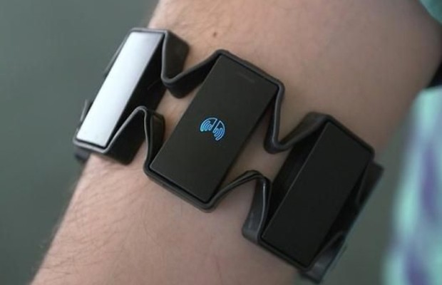 Now, onto the future of this project. The next step in this project will be to do a complete redesign of both the circuit and the physical bracelet. As I stated in the previous post, in this next iteration of the electrical design, I will remove the transistor configuration and replace it with a H-Bridge IC and I can remove the voltage boosting section of the circuitry. This will drastically reduce the size. Then I plan to change the wrist strap to make it less cumbersome to put on. The goal would be to have it closely resemble a Myo armband in terms of esthetics and size like the one in the image below.