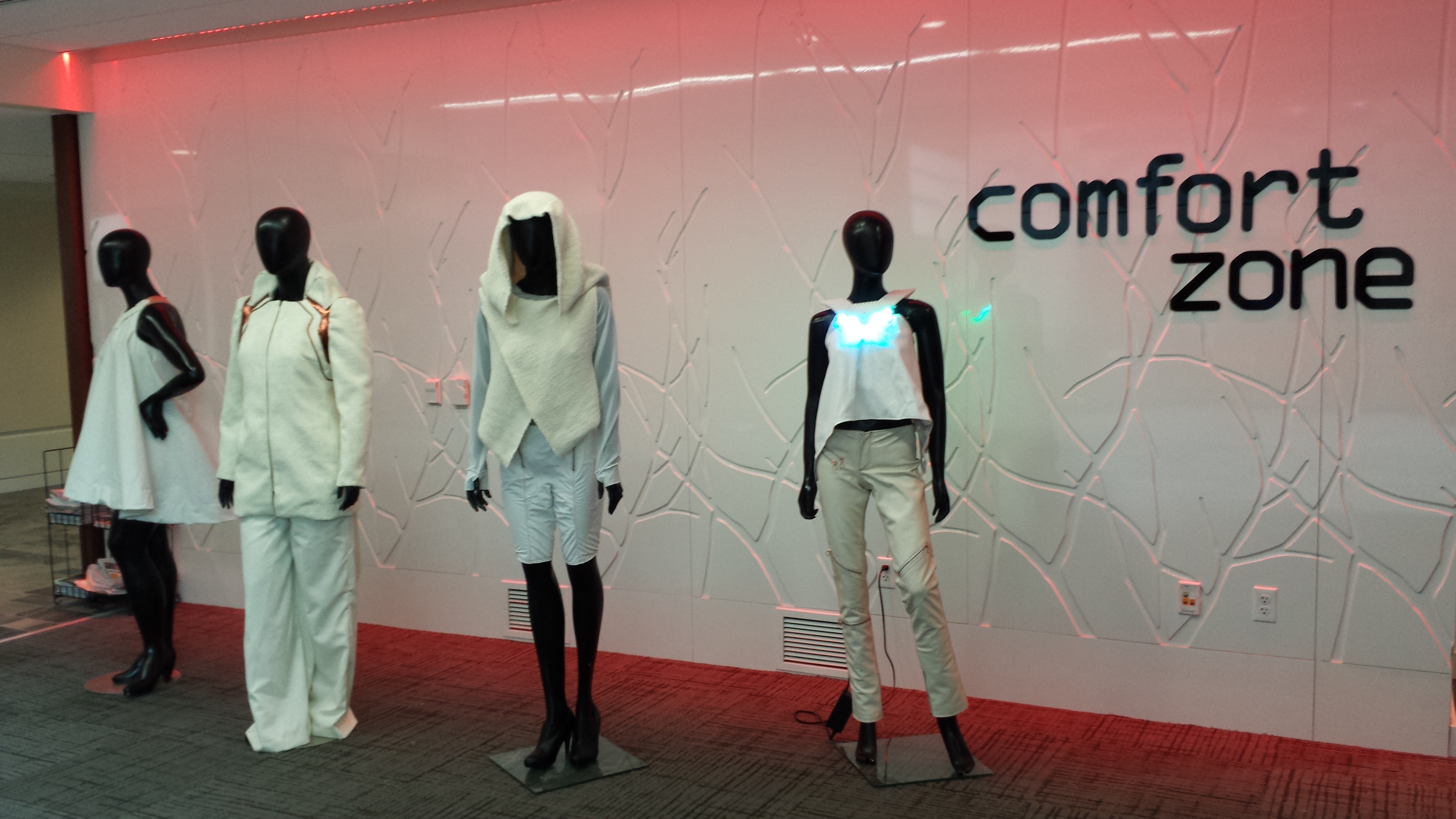 I had a show! While none of the pieces fully functioned the way I planned, I’m happy to say that I did pull together enough to put on an exhibition that I felt was pretty well received. There was a lot of enthusiasm about both the garments themselves and the technologies integrated into them. I’ll review the final outcome of each garment below..