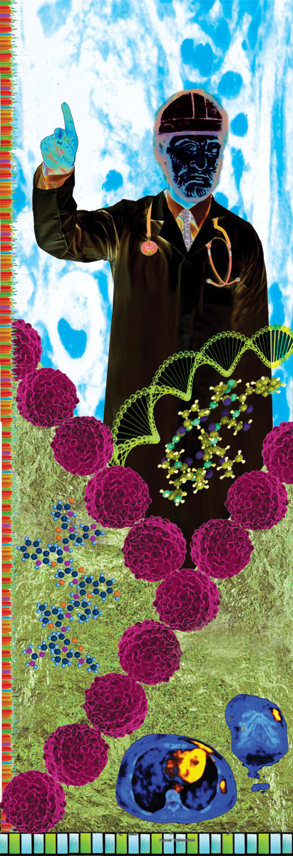 Panel 2 – Bottom part indicates my Mother’s medical condition: Red cancer cells form diagonal frames, Breast cancer MRI, chemical modules of chemotherapy. In upper part, there is a main character figure indicating he is a doctor or medical professional.
