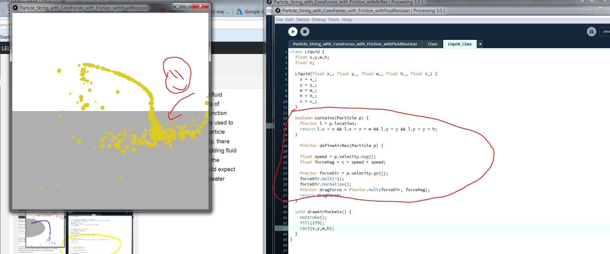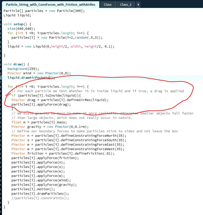 I wanted to add a region to the sketch where the particles would experience a fluid resistance akin to falling into water or an air pocket. There are two key aspects of adding selective fluid resistance to our simulation. First, there needs to be a function that detects a “collision” with the region and returns a boolean, which would be used to activate a certain behavior. The behavior we are wanting to activate when a particle collides with our region is the initiation of a new force to be added. So secondly, there needs to be a function that defines the force to be experienced. When I was adding fluid resistance functionality to my particle string, I opted to add this functionality to the Particle class rather than to the Liquid class. But it didn’t work. If it did, we would expect the smaller particles (which are assigned a smaller mass), to experience greater attenuation of speed as they go down.
