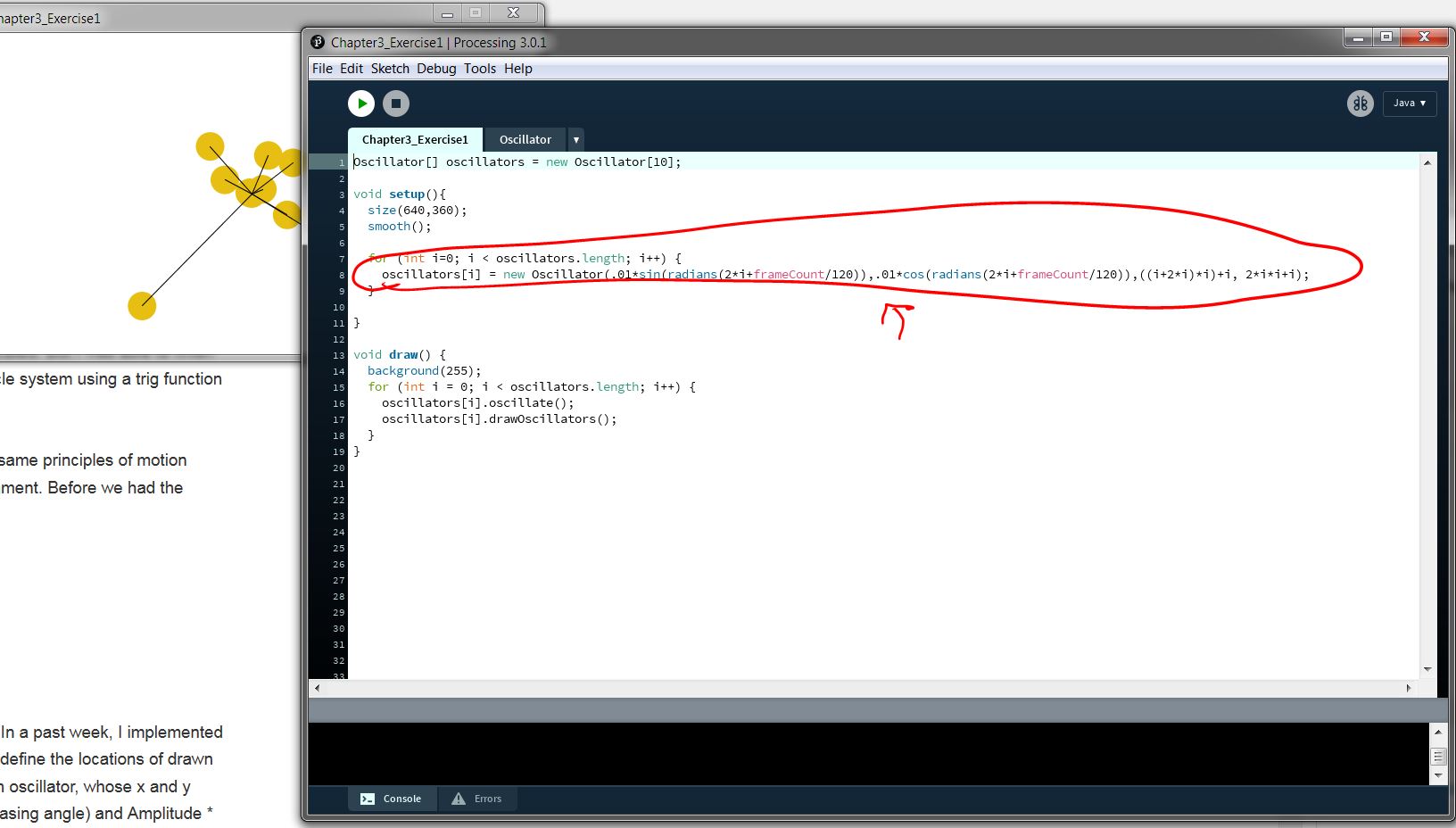 We know that both sin and cos oscillate between (-1,1). In a past week, I implemented the notion of using trig functions with the frameCount to define the locations of drawn elements. This is essentially what we will do also with an oscillator, whose x and y coordinates will be given by Amplitude * sin( some increasing angle) and Amplitude * cos (some increasing angle). The first exercise asked me to find a way to make a pattern out of an array of oscillators. I used trig functions to make initialize the velocities in a rhythmic pattern: