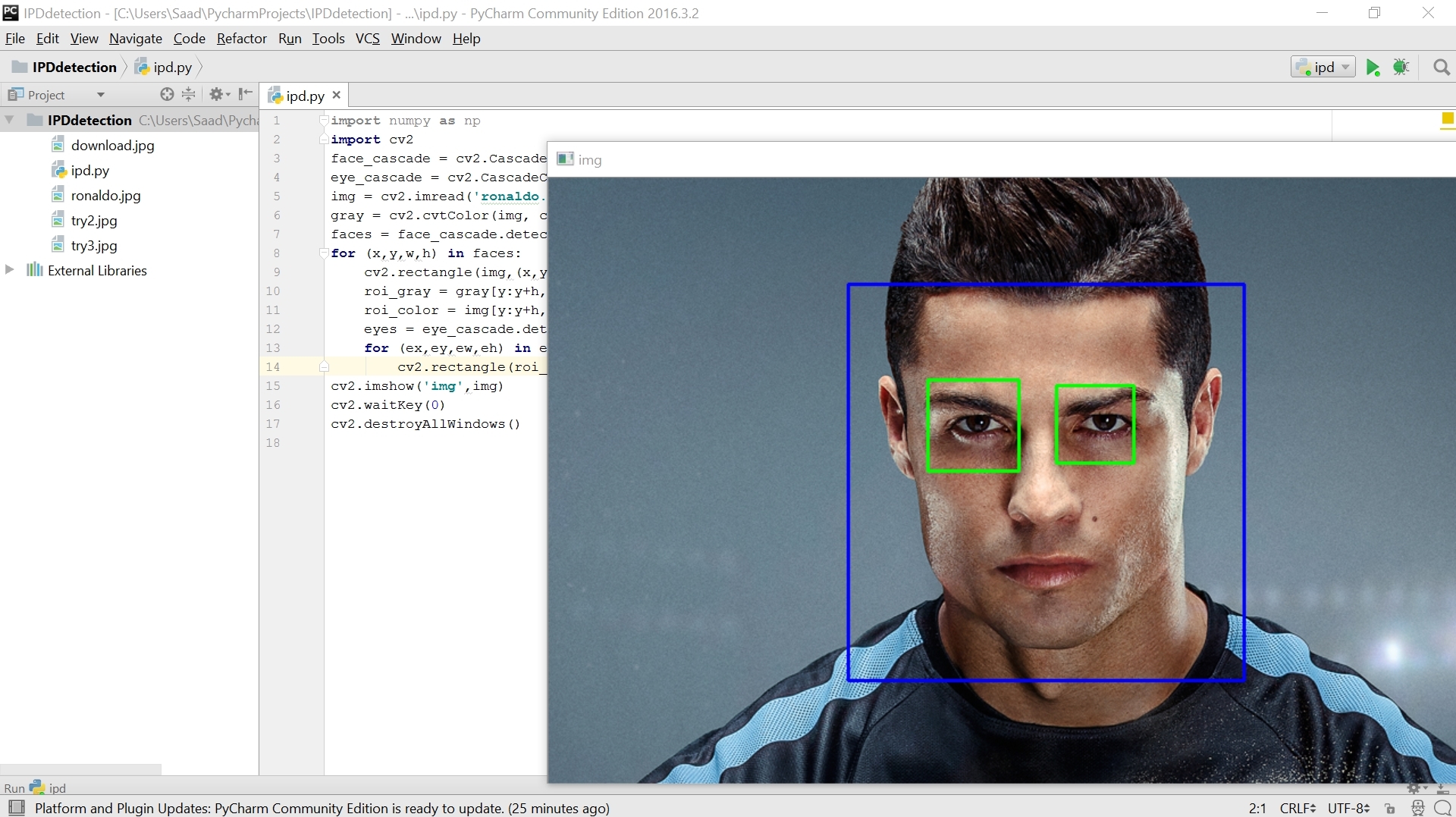 A lot of time was spent on getting to detect the face and eyes via Haar Cascades. This was accomplished relatively easily for photos with the help of the openly available tutorial, though there was a little hiccup where the program wouldn’t run at all. There was some trouble with the Haar Cascade parameters and learning how to integrate the xml files as the tutorial was based on a different version of OpenCV than I am currently using, but with some digging I was able to find a solution: