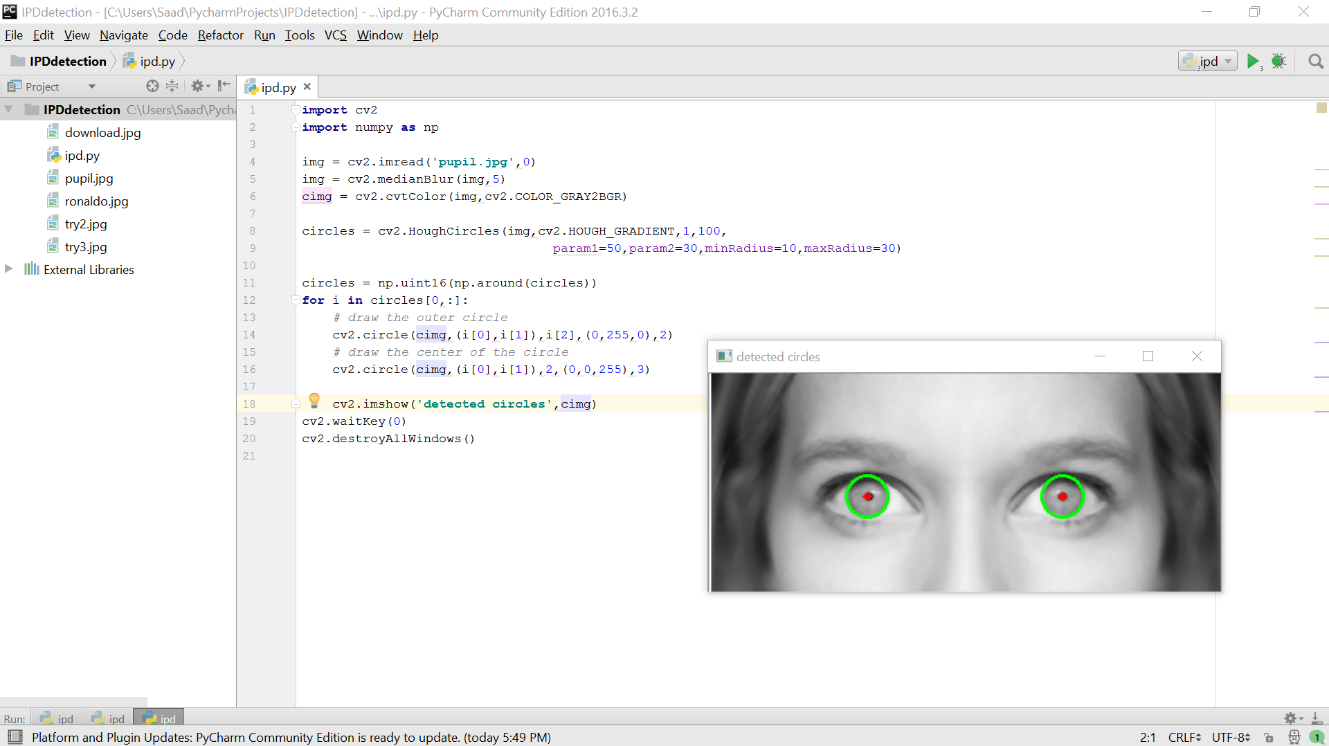 I still felt like I wasn’t making much progress and all my time and effort was scattered in multiple places so I decided to try and focus on pupil detection for pictures, which I was struggling with using blob detection, so I looked into some other methods and Hough Circles worked out pretty well for me through the tutorials at http://docs.opencv.org/3.1.0/da/d53/tutorial_py_houghcircles.html and of course, changing the parameters around to accommodate for the objects we care about. (is hough circles a viable alternative?)